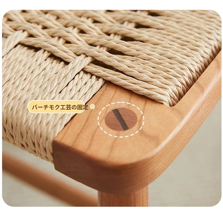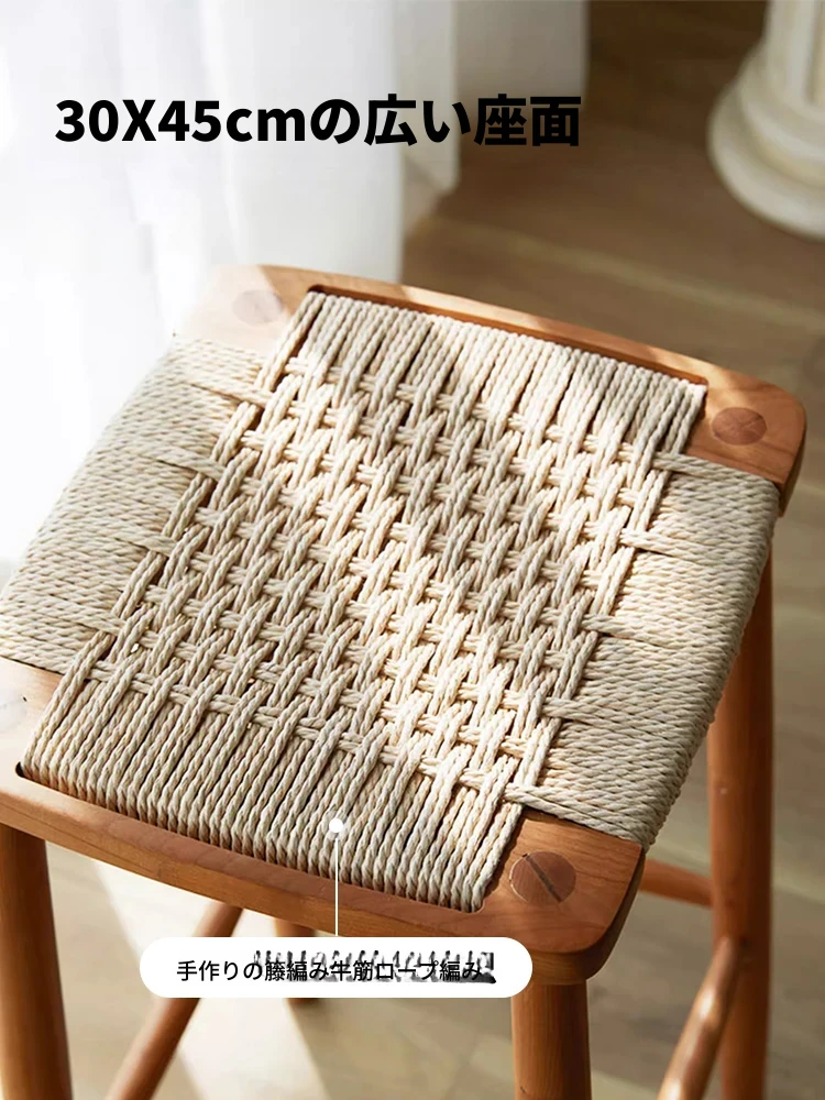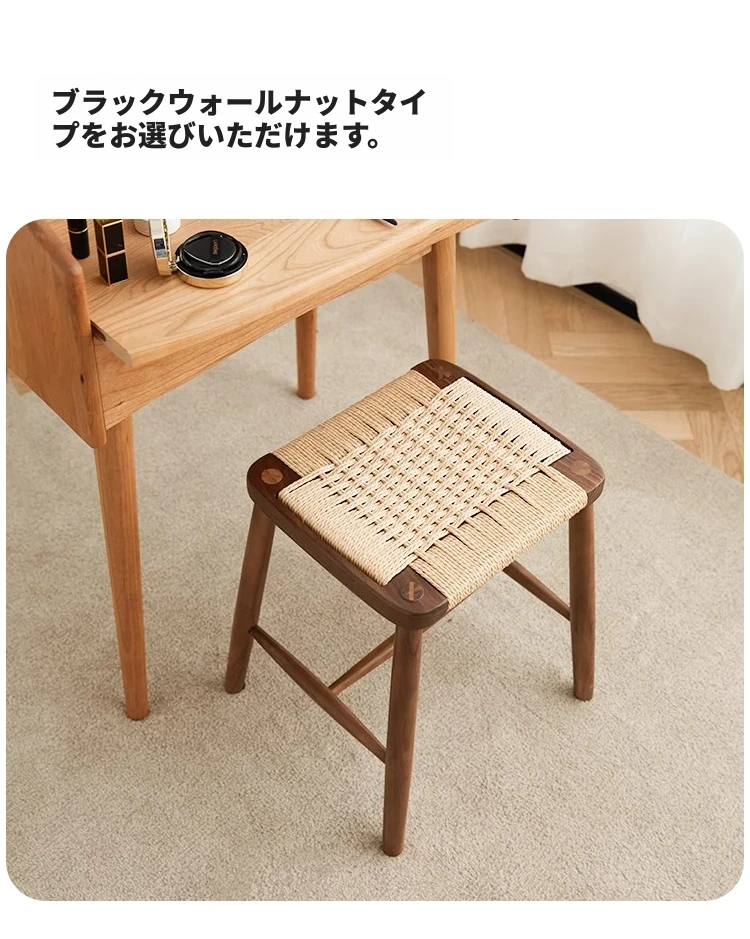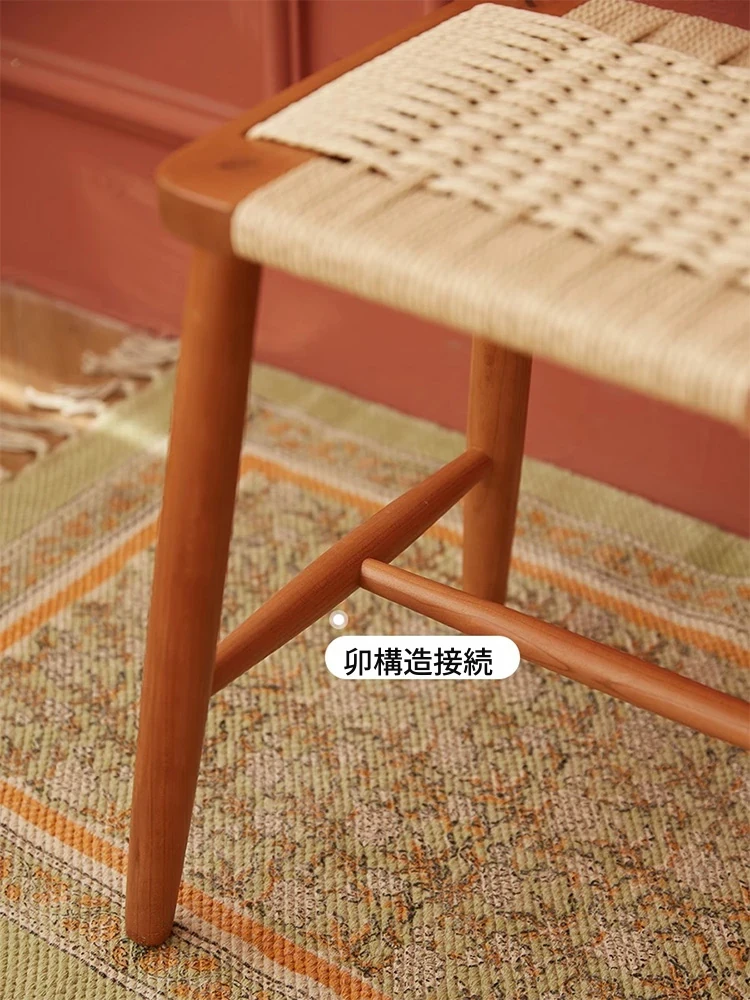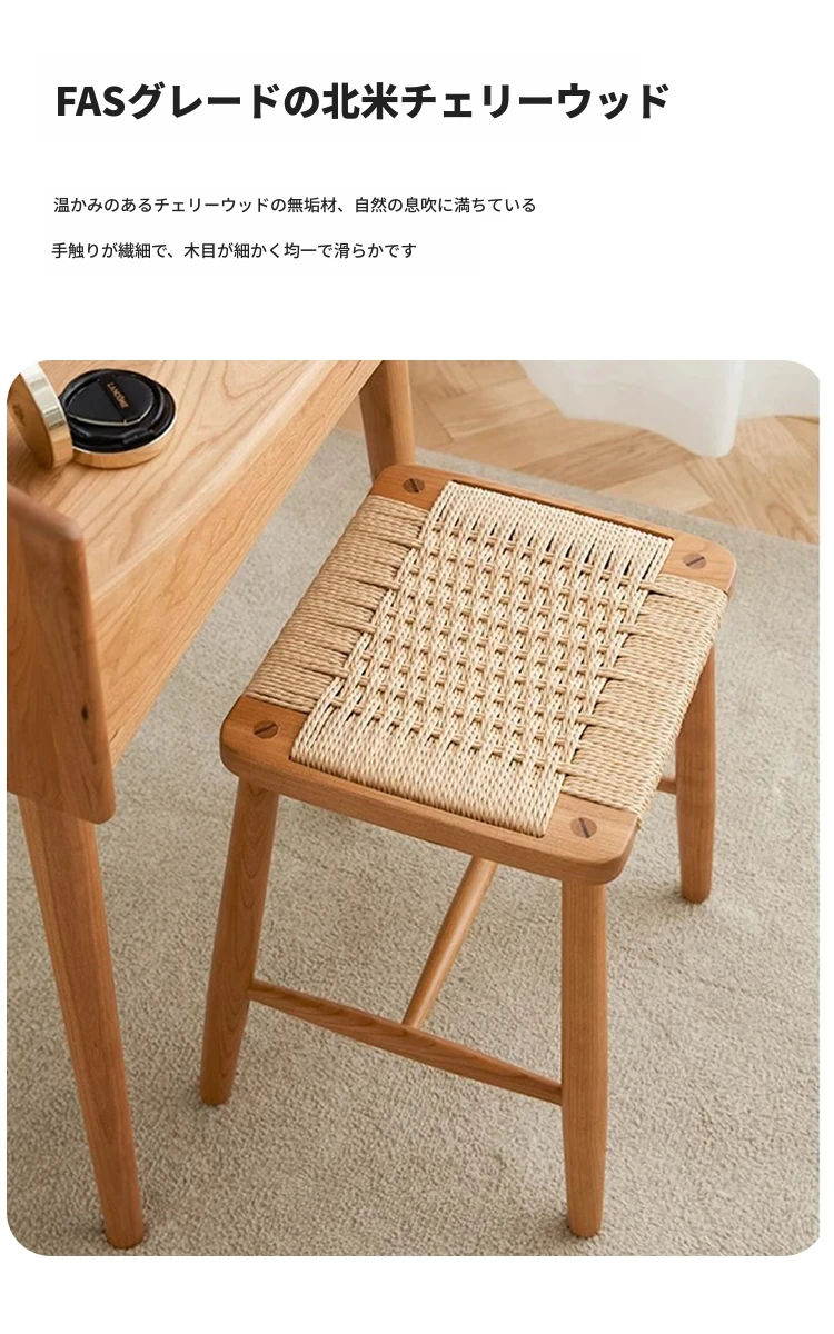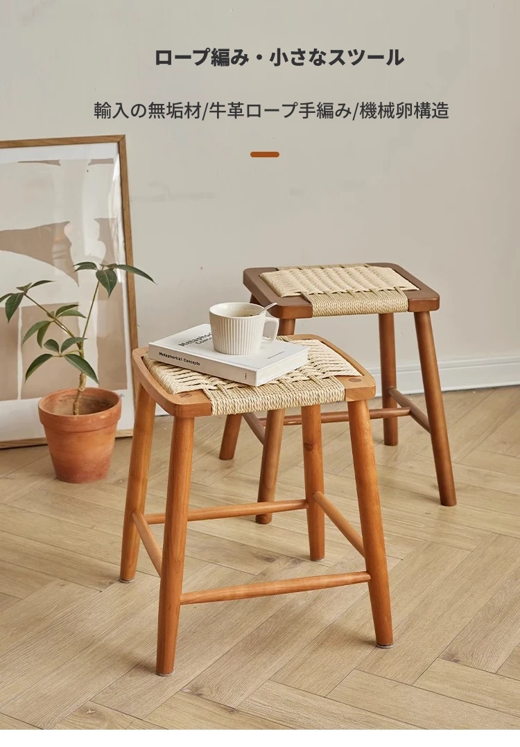 北欧風チェリーウッドのロープ編みミニスツール - シンプルでスタイリッシュな和風ドレッシングチェア、籐編みの靴替えスツールやメイクアップスツールとしても最適!